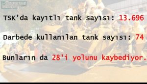 - TSK’nın sahip olduğu 13.696 tanktan sadece 74’ü “darbe”ye katıldı. Onların da 28 tanesi yolunu kaybetti.