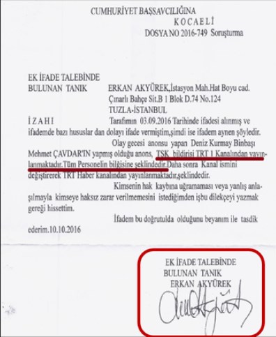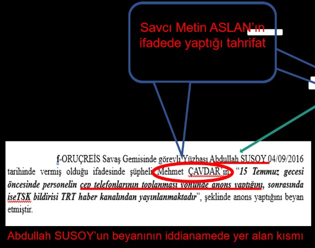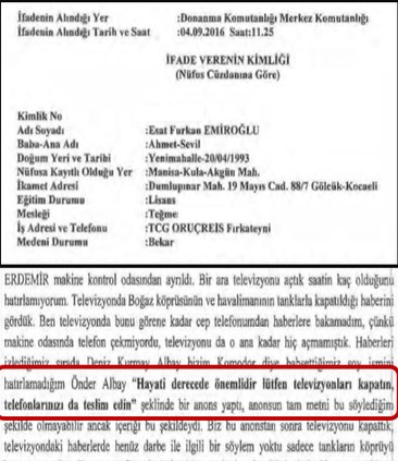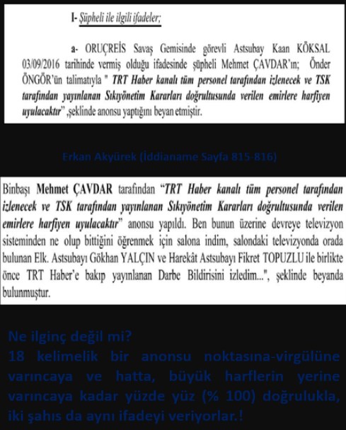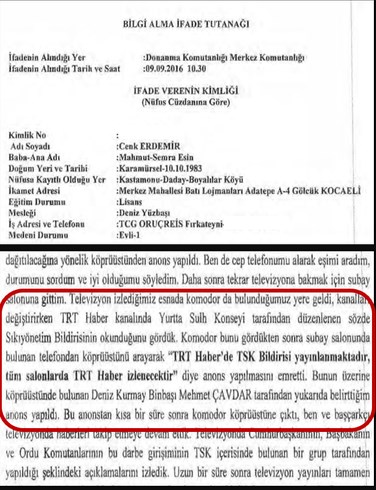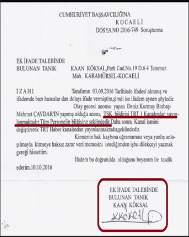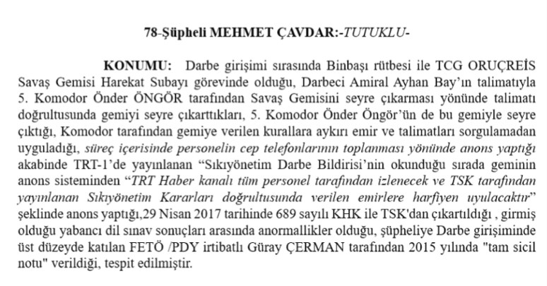 - İDDİA-3: TSK BİLDİRİSİNİN YAYINLANMASINA İLİŞKİN ANONS YAPILMASI: 3’üncü sicil amirim 5 Komodor Albay Önder ÖNGÖR’ün emri üzerine içeriğini bilmediğim “TSK Bildirisi TRT Haber Kanalında Yayımlanmaktadır. Salonlarda İzlenebilir.” şeklinde anons yaptım.