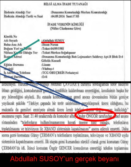 - Seyrin ilerleyen saatlerinde darbe girişimi öğrenilince, cep telefonu kullanımı, yasak olmasına rağmen bulunulan koşullar dikkate alınarak Komodor ve Komutan tarafından serbest bırakılmıştır.