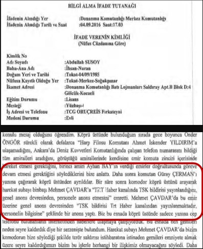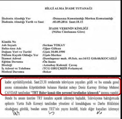 - İDDİA-3: TSK BİLDİRİSİNİN YAYINLANMASINA İLİŞKİN ANONS YAPILMASI: 3’üncü sicil amirim 5 Komodor Albay Önder ÖNGÖR’ün emri üzerine içeriğini bilmediğim “TSK Bildirisi TRT Haber Kanalında Yayımlanmaktadır. Salonlarda İzlenebilir.” şeklinde anons yaptım.