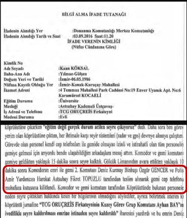 - Kullanımı zaten yasak olan cep telefonlarının kapatılması ve toplatılması konusunda bir anons yapmadım. Cep telefonlarının kapatılması ve toplanması emri komodor Önder ÖNGÖR tarafından verilmiştir. Anonsa ilişkin beni doğrulayan yaklaşık 20 tanık ifadesi vardır.
