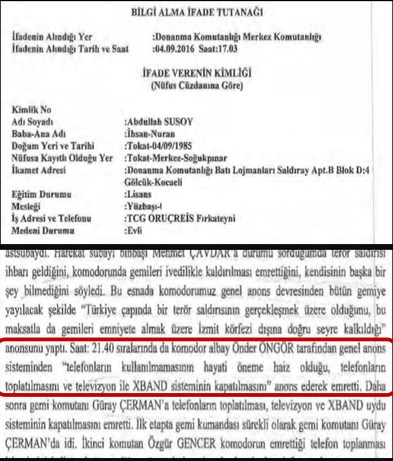 - Seyrin ilerleyen saatlerinde darbe girişimi öğrenilince, cep telefonu kullanımı, yasak olmasına rağmen bulunulan koşullar dikkate alınarak Komodor ve Komutan tarafından serbest bırakılmıştır.
