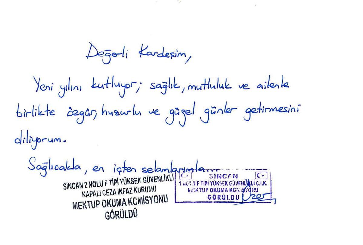- 28 Aralık. Bir yıl daha bitiyor. Mahzunuz. Sincan kampüsünde, F-1 cezaevinde kalan devre arkadaşımdan yeni yıl kartı aldım. F-1’in mektup okuma komisyonu incelemiş. Bizim komisyon bir daha okumuş. Nihayet şifreli mesaj, kaçış veya isyan planı bulamayıp teslim ettiler.