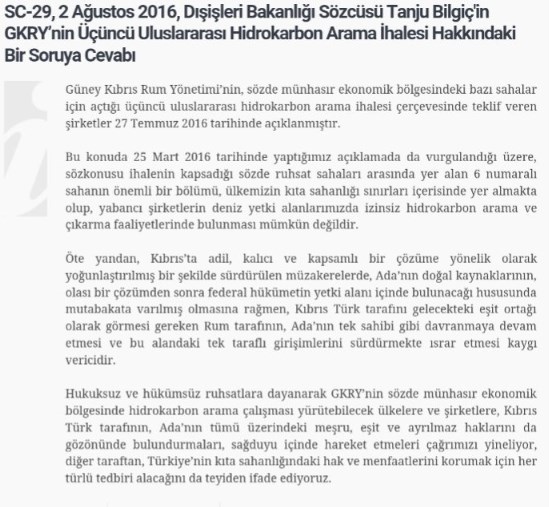 - Bu kapsamda, GKRY’nin sözde MEB bölgesine yönelik çıktığı üçüncü uluslararası hidrokarbon arama ihalesine teklif veren şirketlerin isimlerinin 27 Temmuz 2016 tarihinde açıklandığı tespit ederek, Türkiye’ye etkileri konusunu Türk Gnkur.Bşk.lığı ve Dz.K.K.lığına raporladım.