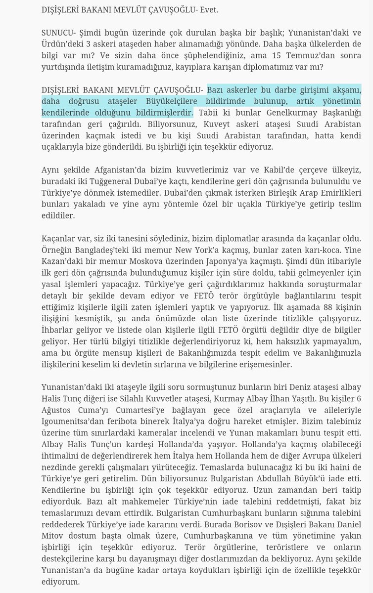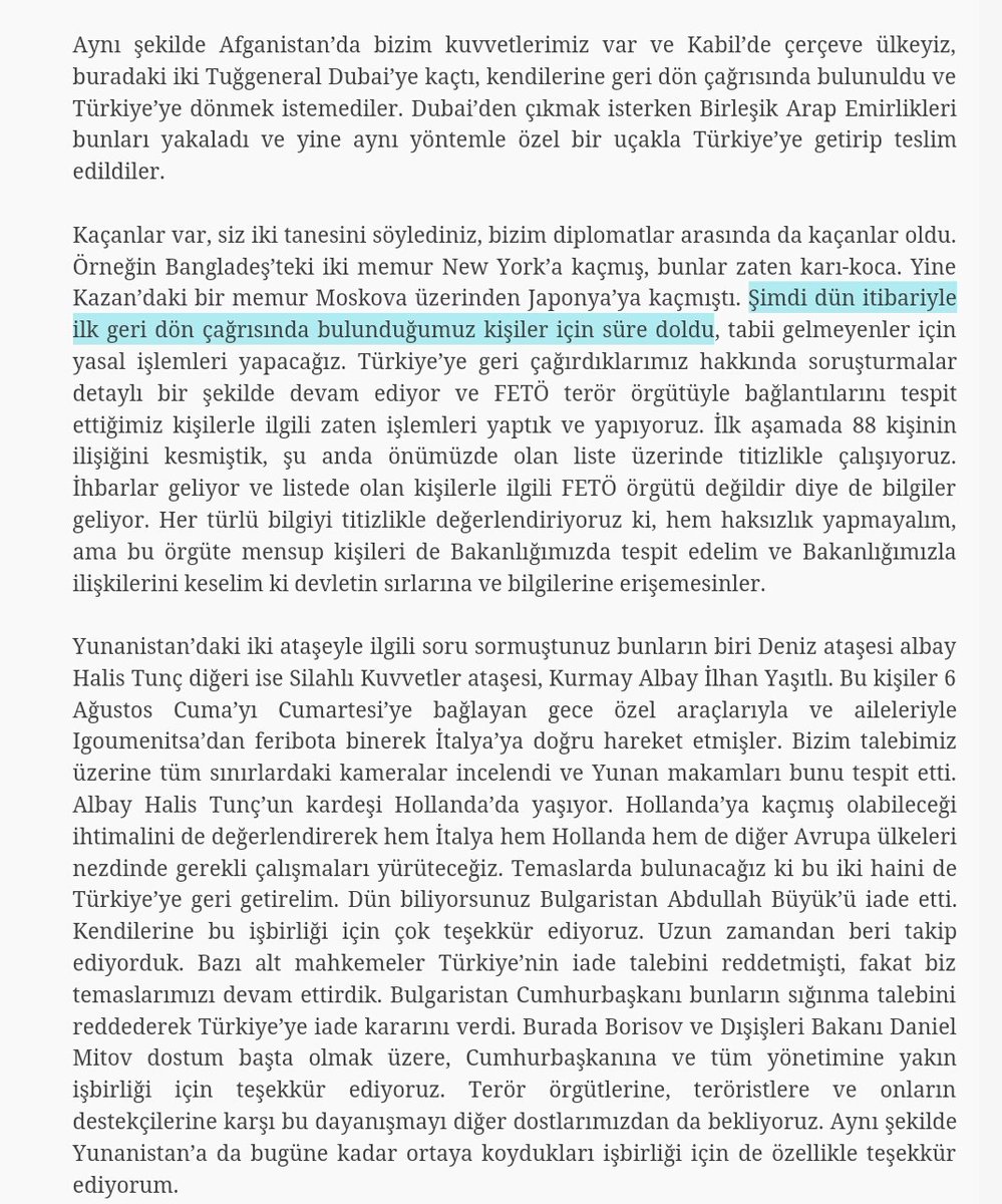 - Çavuşoğlu 11 Ağustos’ta “Şimdi dün (10 Ağustos 2016) itibariyle dön dediğimiz kişiler için süre doldu, gelmeyenler için yasal işlemleri yapacağız.”dedi. Peki öyle miydi? Hayır çağrılan Ataşler için