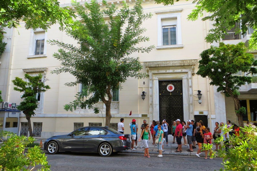 - Atina Ataşelik Ofisi diğer ülkelerden ayrı olarak Büyükelçilikten tamamen ayrı bir binada konuşludur. Yani ben dahi ataşe olarak elimi kolumu sallayarak Elçiliğe giremem. Dış kapıda zil çalınır.Güvenlik hizmeti veren silahlı Türk polisler kameradan sizi görerek müsade eder.