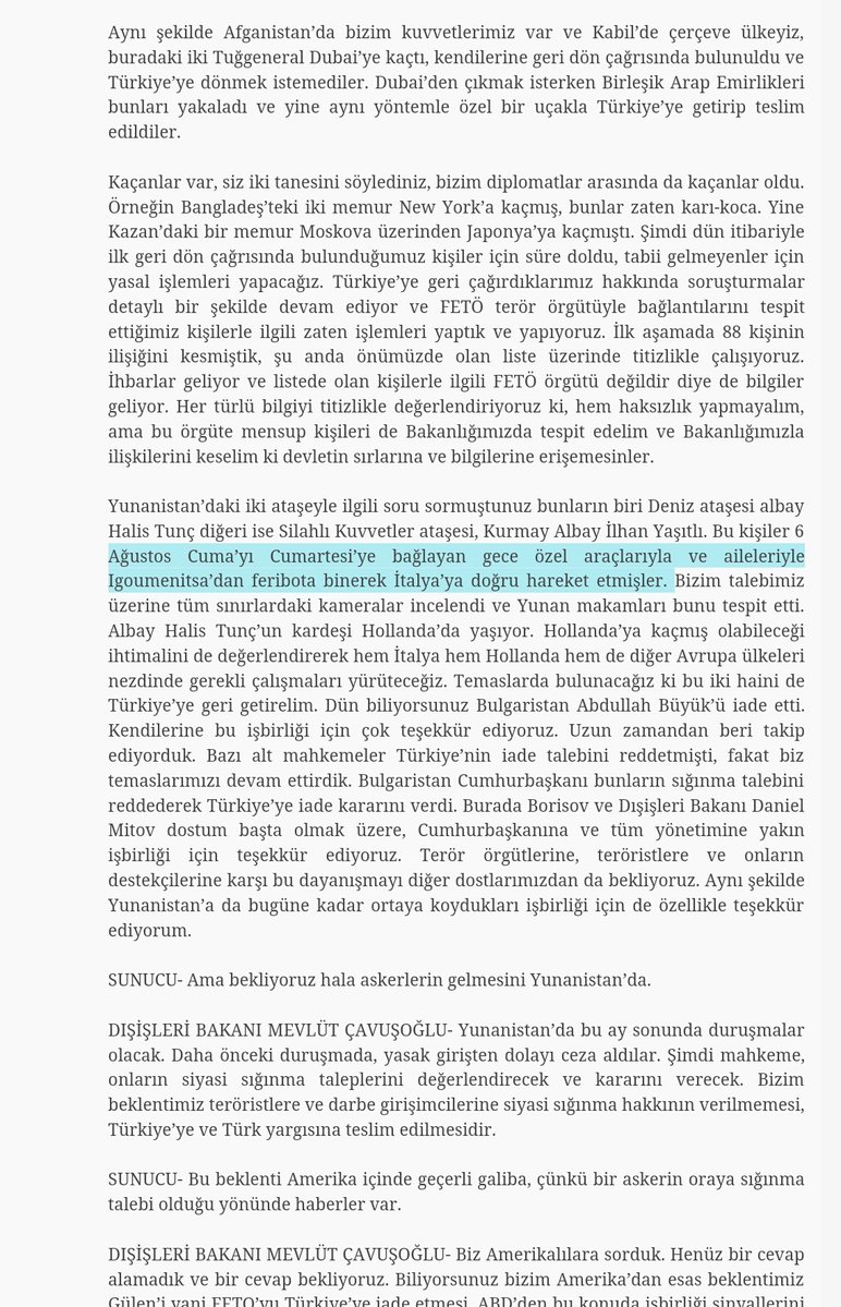 #yunanistan Igomenitsa limanından feribota binerek,#italya‘ya geçti, Italya’dan onu da isteyeceğiz” diyecektir. Umarım Italya’ya sormuşlardır. Çünkü ben#Ağustos 2016 ayında feribata hiç binmedim.