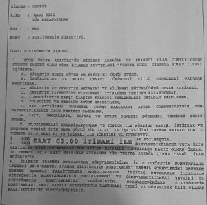 - Saat 21.48.. Genelkurmaydan sıkıyönetim direktifi ve atama listesi yayımlanır. Direktifte, darbenin saat 03.00’de başlayacağı yazılıdır!