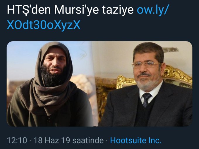 - Dünyada bir çok ülkenin (Türkiye dahil) terör örgütü listesinde bulunan HTŞ’nin Mursi için taziye yayınlaması da iki tarafın kardeşliğini gösterir önemli bir belgedir.