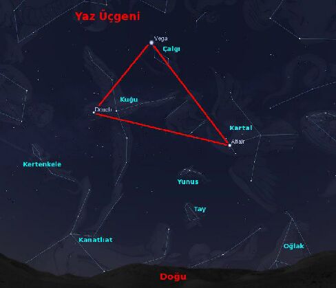 - Haziran-Temmuz-Ağustos aylarında Çalgı, Kuğu, Kartal, Yay, Akrep, Yılancı, Yılan, Kalkan, Terazi, Oğlak, Yunus, Kuzey Tacı, Herkül gibi takımyıldızları gözlemlenebilir. Konumları bulunduğunuz yarımküreye göre değişim gösterir.