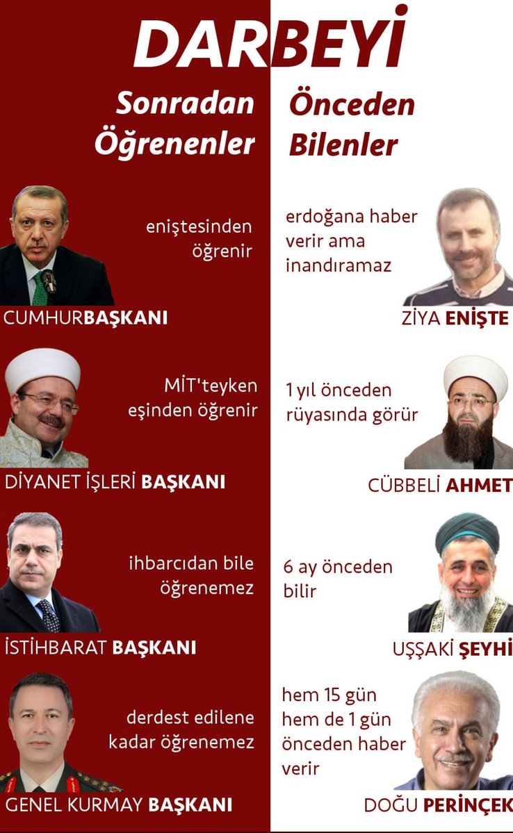 - Şimdi bilin bakalım Erdoğan darbeyi kaçta öğrendi ? 2 senedir ben hangi Erdoğan doğru söylüyor inanın karar veremedim. Bir de siz bakın belki doğru söyleyeni bulursunuz? Yoksa hepsi mi yalan söylüyor!?