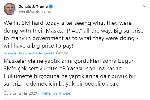 - Trump’ın kendisine gelen “Kan İçenler.” Hakkındaki istihbarattan sonra 3M şirketi için attığı tweet.