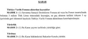 - Savunma Sanayii Destekleme Fonuna ait 3 milyar TL 3 ay sonra ödenmek şartıyla Varlık Fonu’na aktarılmıştır.