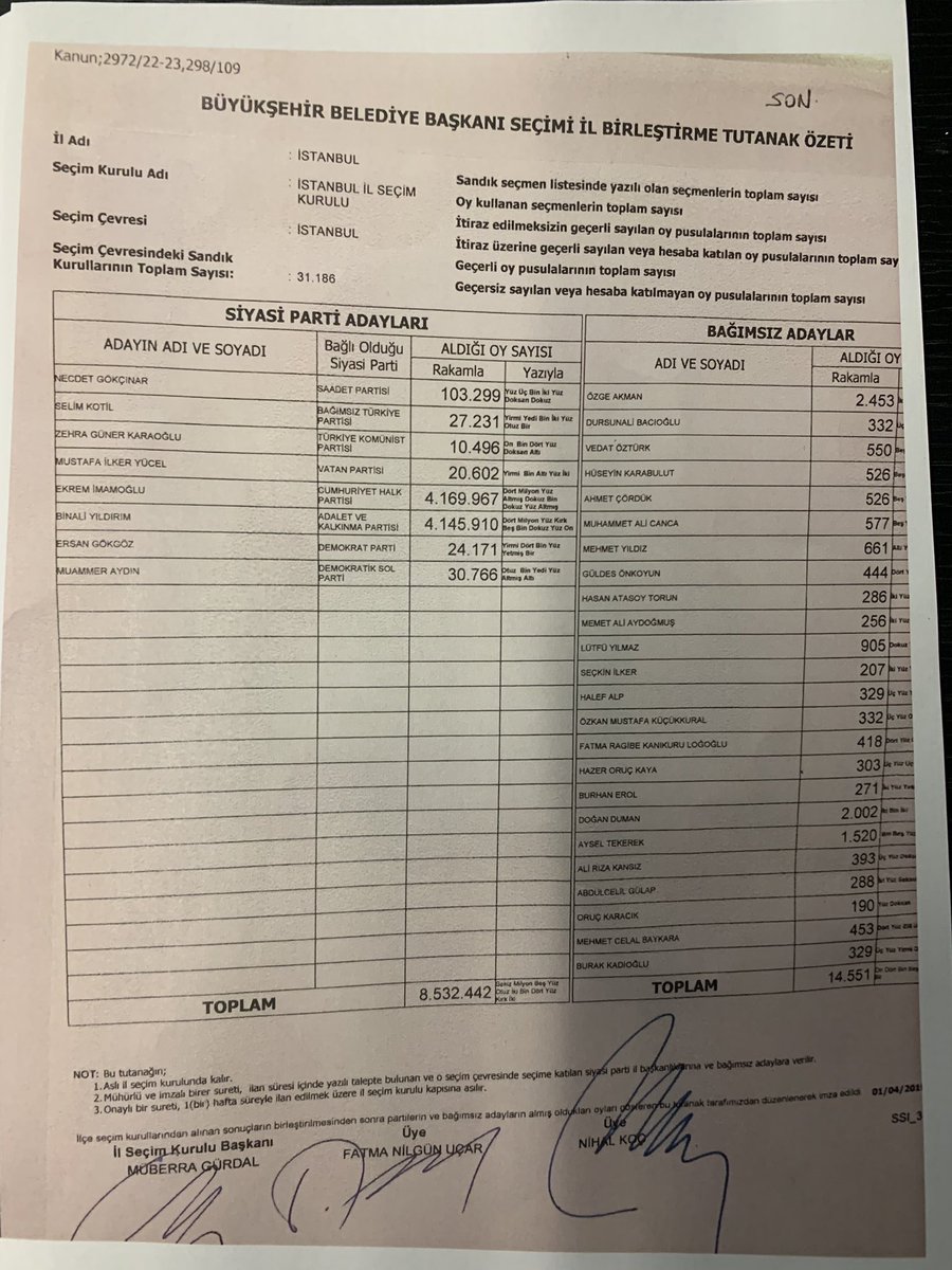 - Seçimin hemen ardından 1 Nisan günü açıklanan birleştirme tutanağına göre oy durumu; 4.169.967 oy. Ekrem İmamoğlu 4.145.190 oy Binali Yıldırım almış. 1 Nisan günü aradaki fark 24.777 dir.