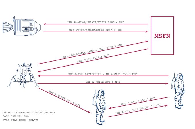 - MSFN: insanlı uzay uçuş ağı İletişim her iki mürettebat için çift modda olacak ve haberleşeceklerdir. Ok yönlerini takip ediniz VHF(very high frequency) ile bir ses kaç MHz ile iletiliyor.