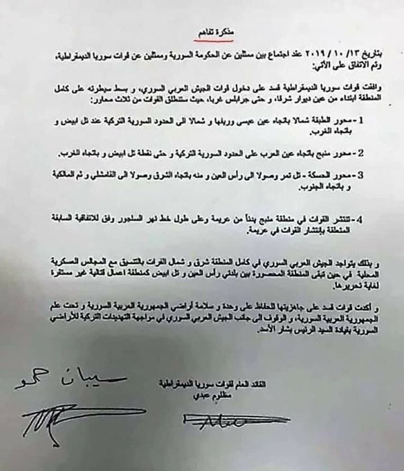 - Terör örgütünün Suriye Rejimi ile işbirliğini ve rejimin(Esad’ın) üstünlüğünü taahhüt ettiği anlaşmada terör örgütü adına Siphan Hamo ve Mazlum Abdi isimli teröristlerin sözde imzaları bulunuyor. Anlaşmaya göre Rejim’in Kuzey Suriye’ye üç bölgeden girmesi söz konusu oluyor: