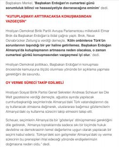 - 31) Merkel, Erdoğan, Cumhurbaşkanılı seçiminde Köln’e gittiğinde de ‘Lütfen itidallı ve sorumlu davranın’ diye uyarmıştı.