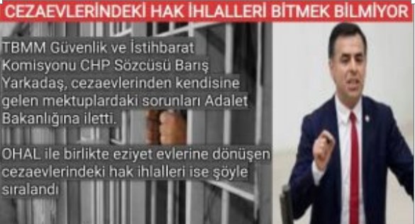 TBMM Güvenlik ve İstihbarat Komisyonu CHP Sözcüsü Barış Yarkadaş, cezaevlerinden kendisine gelen mektuplardaki sorunları Adalet Bakanlığına iletti.