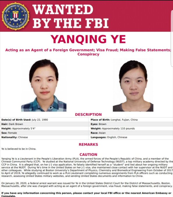 - Aşağıda resmi olan 29 yaşında ki YANQİNG YE isimli, Aslında Çin ordusunda teğmen olan biyolog kızımızı “araştırma görevlisi” olarak boston üniversitesine gönderiyor. Ve kızımız profun da yardımı ile bazı bilgileri çalmaya başlıyor. ABD bunu anlıyor aslında ve aldığı bilgiler ile kaçmasına da müsade ediyor sonradan arama kararı çıkarıyor.