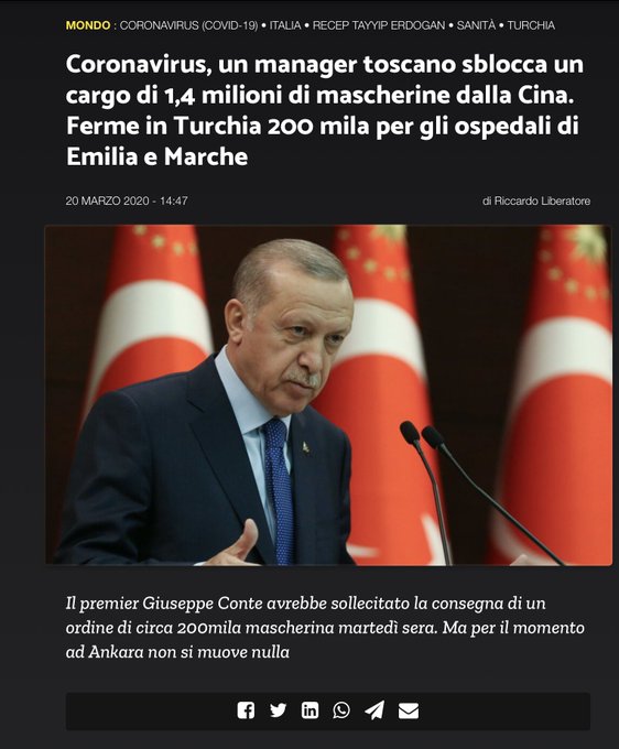 italyan basını türkiye’nin 1 milyon maske satma konusunda italya ile anlaştığını, paranın ödendiğini ama 15 gündür 200 bin maskenin gelmediğini söylüyor..