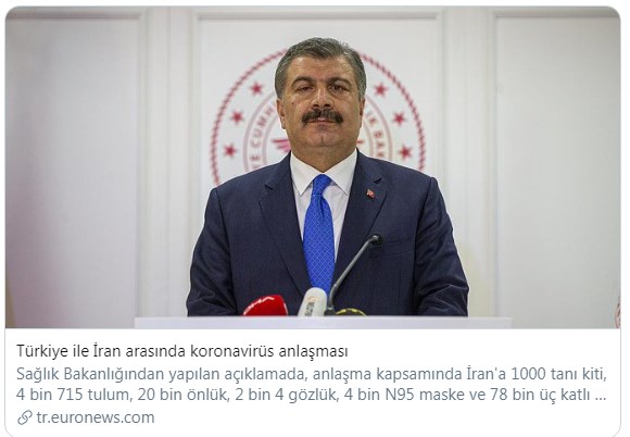 - Ya da bunlar? Türkiye ile İran arasında koronavirüs anlaşması: Bin tanı kiti, 4 bin 715 tulum, 20 bin önlük, 2 bin 4 gözlük, 4 bin N95 maske ve 78 bin üç katlı maske İran’a hibe edildi.