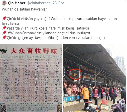 Wuhan’da satılan hayvanlar;  Çin’deki virüsün yayıldığı #Wuhan ‘daki pazarda satılan hayvanların fiyat listesi. Pazarda yılan, kurt, koala, fare, misk kedisi satılıyor.  #WuhanCoronavirus yılandan geçtiği düşünülüyor. Çin’de geçen ay tavşan böbreğinden veba vakaları olmuştu.
