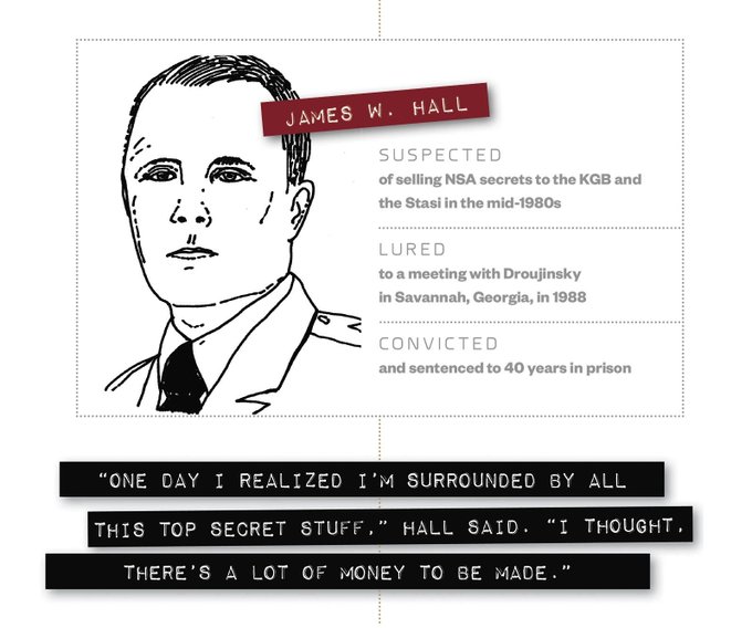 - 1981-1985 arası Berlin’deki Amerikan üssünde 1986’da ise Frankfurt’ta görev yapan Hall, 1987’de ABD’ye dönmüştü. Severin’in ifadesi üzerine bir FBI ajanı kendini KGB ajanı olarak Hall’a tanıttı ve para karşılığı gizli belge istedi. Hall bu tuzağa düştü.