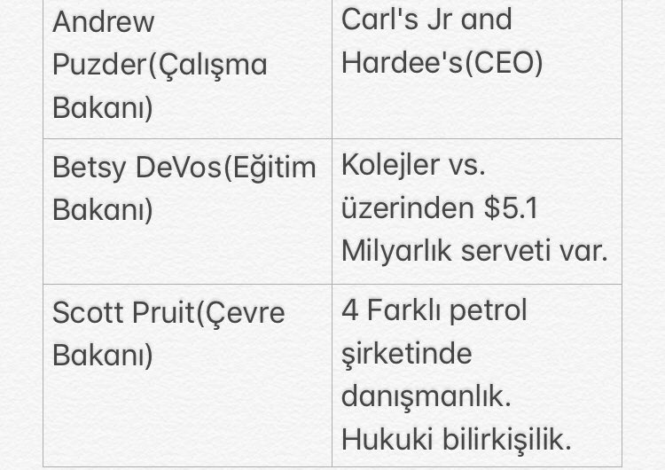 - Size Şirketokrasi’nin Trump’ı nasıl seçtirdiğini anlattım. Trump’ın şirketokrasi yararına işlerini anlatmadan önce, Donald Trump’ın kabinesiyle ilgili şu tabloya göz atalım.