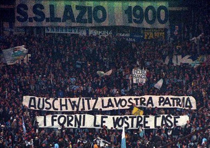 - Siyasi boyutundan uzaklaşma sebebi ise Roma taraftarlarının bilinen eski sol kimliğinden uzaklaşması. Buna rağmen Lazio taraftarları için karşı cephe halen bu pankartla ifade ettikleri kadar nefret edilesi; “Auschwitz vatanınız, fırınlar eviniz”.