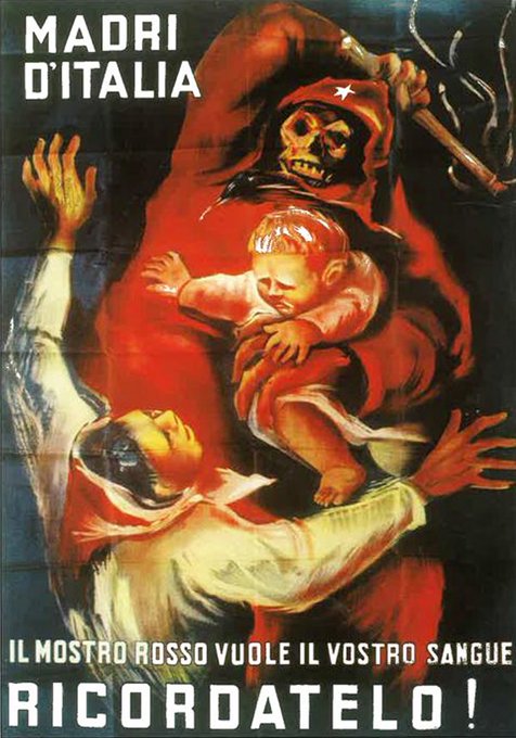 - Namus olgusunun bulunmadığı, bu nedenle kadınların ortalık malı olarak kullanıldığı, eğer komünistler iktidara gelirlerse ulu bir medeniyet olan Katolik İtalya’nın binlerce yıllık tüm değerlerinin yok olacağı gibi kara propaganda örnekleridir.