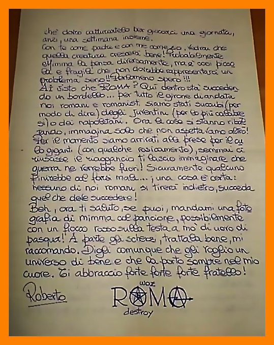 - Başarı taraftarlarına geçit vermeyecekleri, kuzeyli zengin kulüplere karşı onurları ve kendi evlatlarıyla mücadele edecekleri, Roma kulübünün gerçek sahibinin taraftarlar olduğu, futbolcuların taraftarlara hesap vermekle yükümlü oldukları gibi futbola dair hükümlerin yanı sıra bundan böyle Roma taraftarlarının güvenliğini kendilerinin sağlayacağını ve İtalyan polisini stadlarda görmek istemediklerini ilan ettikleri bir manifestodur bu.