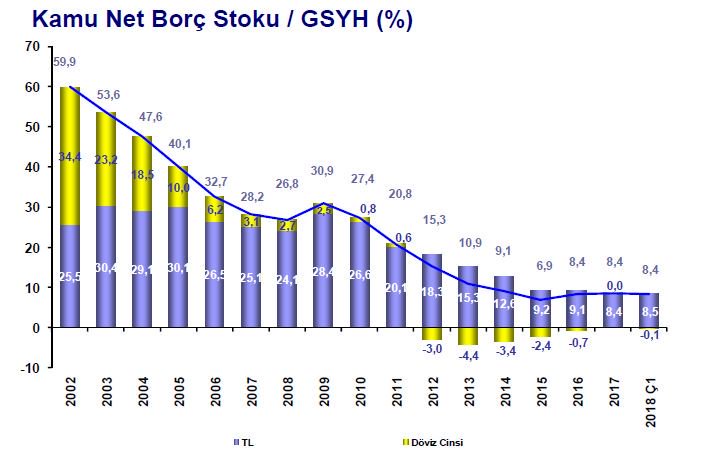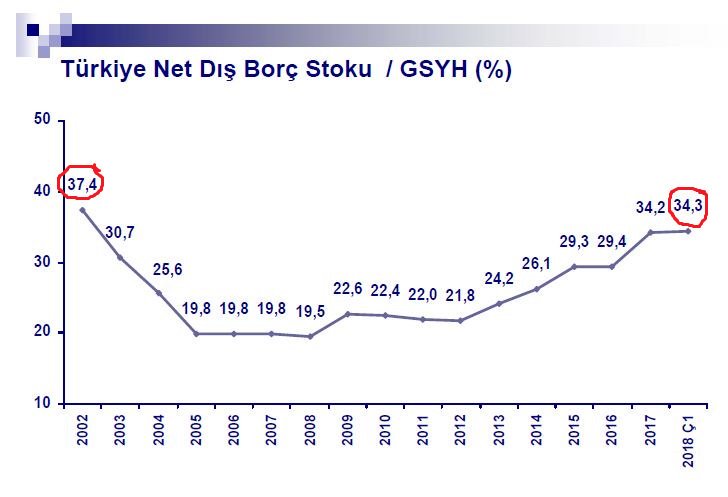 - 2016’da ise benzer bir şekilde %19 oranında yine “bir gecede” büyümüştük. Toplam etkisi yaklaşık %50 olan bu iki güncelleme olmasaydı brüt dış borç oranı %80, net dış borç oranı ise %52 ile şu anda çoktan rekor kırmış olacaktı.