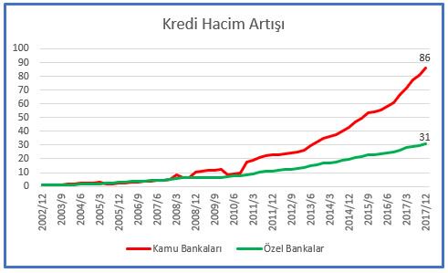 - Bu görselde TBB (Bankalar Birliği) verilerince 2002’den 2017’ye kadar kamu bankalarının (86 katına çıkmış) ve özel bankaların (31 katına çıkmış) kredi gelişimlerini bulabilirsiniz. 2013 sonrasında kamu bankaları kredi hacminin özel bankalara kıyasla çok daha fazla artmış.