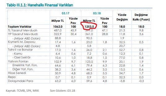 - Peki vatandaşın parası var mı ki de bu borcu üstlenebilsin? Bu görselde TCMB tarafından hazırlanan 2018 Mart ayına ilişkin hane halkının sahip olduğu finansal varlıklar bulunuyor. Vatandaşın yaklaşık 1,254 trilyon TL finansal varlığı bulunmakta.