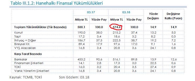 - Hemen borç tarafına da bakarak net resmi çizmeye çalışalım. Aşağıdaki görsel hane halkı finansal yükümlülüklerini gösteriyor; vatandaşın ilgili tarihteki toplam borcu 575 milyar TL. Vatandaşın kendisine ait olmayan borcu ödeme kapasitesi var görünüyor.