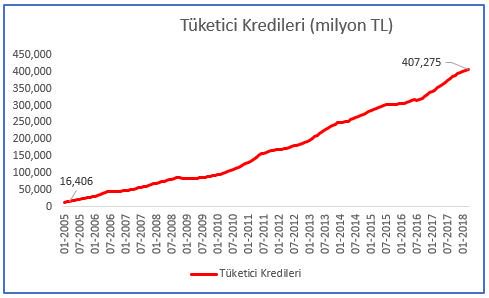 - Tüketici kredileri 2004 sonrasında 16,4 milyar TL’den 407,3 milyar TL seviyesine ulaşmış. Yani vatandaş henüz özel sektörün ve bankaların borcu üstüne kalmadan şimdiden varlıktan yoksun, günlük hayatını devam ettirebilmek için rekor düzeyde borçlanmış.