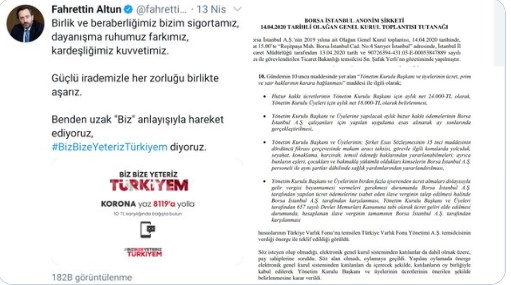 • diziye fahrettin altun’u konuk ediyoruz. bizbizeyeteriz deyip her vatandaştan 10tl istediğinin ertesi günü erişah arıcan’ın önerisiyle diğer maaşlarına ilave olarak başkan erişah hanım’a 24000, yk üyesi fahrettin bey’e 18000 aylık huzur hakkı ve vergiden muafiyet kararı almışlar.