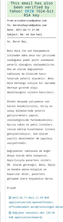 • haziran 2009’da okuldan bir mail daha gelir. “danışmanınız doç. dr. hasan eken hocamız teziniz ile ilgili yapmış olduğunuz çalışmaları en kısa zamanda kendisine göndermenizi rica ediyor.” yazmaktadır. berat bey ısrarla tez danışmanı hocasına yanıt vermez. https://t.co/y8o2pzlU6c