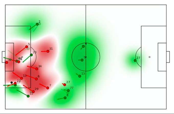 - Bu ikilinin geliştirdiği bir başka model ise pas seçenekleri konusunda. Görselde top ceza yayının ortasındaki yeşilli oyuncuda. Kırmızı ile gösterilen bölgeler pasın başarılı olma ihtimalinin az olduğu, yeşil bölgeler ise fazla olduğu yerler.