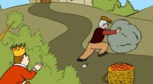 • Sonunda saraya meyve sebze getiren bir köylü çıkageldi.Sırtındaki küfeyi yere indirdi, iki eli ile kayaya sarıldı ve itmeye başladı.