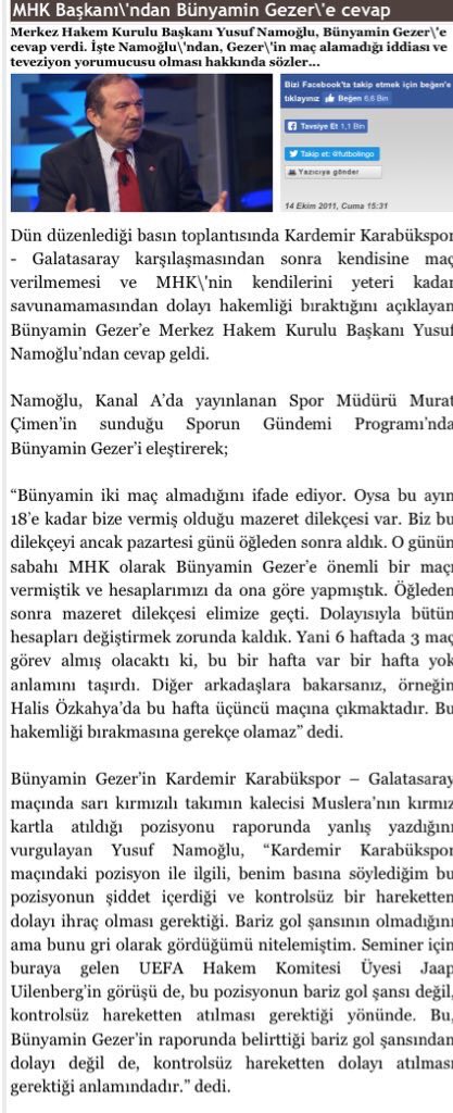 • Ne olursa bundan sonra olur Bünyamin Gezer’e bir daha maç verilmez. Bunun üzerine hakemliği bırakma kararı alır. Asıl ilginç olan konu ise Namoğlunun MHK başkanı sıfatı ile tv programında Bünyamin Gezer’e yanıt vermesidir.