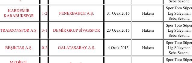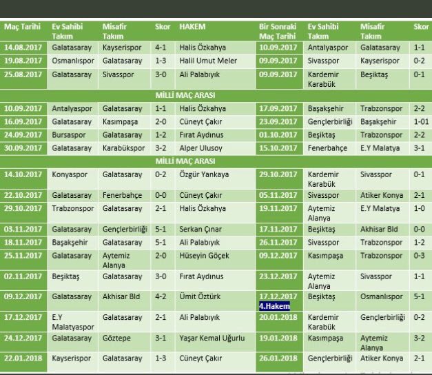 • 18 haftada, Galatasaray maçını yöneten hiç bir hakem bir sonraki hafta TFF 1. Liginde maç verilmediğini ayrıca bilgilerinize sunarım.