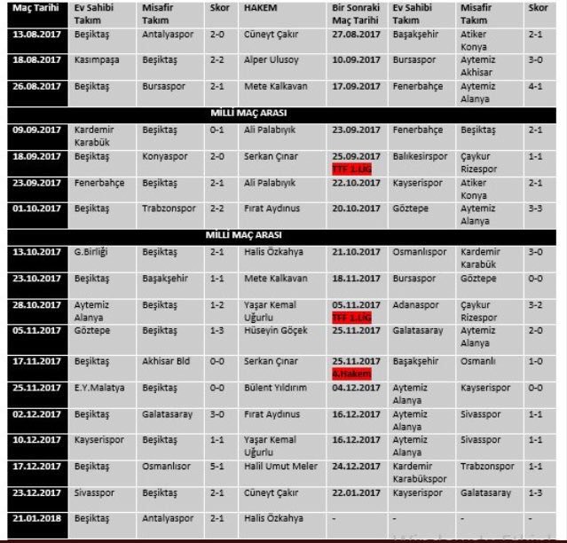 • Elbette tesadüf değil. Bunu nerden mi anlıyoruz? Buyurun. Beşiktaş’ın kazandığı Konya ve Alanya maçının hakemleri sonraki haftada tff 1. Ligine veriliyor. Bir nevi hakemler cezalandırılıyor.