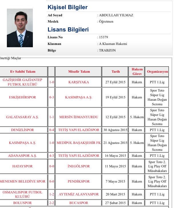 • 2014-2015 sezonunda 13 Aralık 2014 tarihinde o sezon son süper lig maçını yönetiyor. Sebebi mi? Yusuf Namoğlu 16 aralık tarihinde göreve başlıyorda ondan. ilk işi geçmişten hesabı olduğu Abdullah Yılmaz’ın icabına bakmak oluyor.