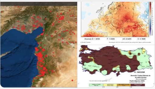 - Birinci harita NASA’dan son üç günün yangın haritası. Sadece Hatay’da değil, Suriye’nin Akdeniz kıyılarında, özellikle Lazkiye taraflarında da feci orman yangınları var. İkinci harita Eylül ayı sıcaklık anomalisi. Üçüncüsü MGM’nin Ağustos kuraklık haritası.