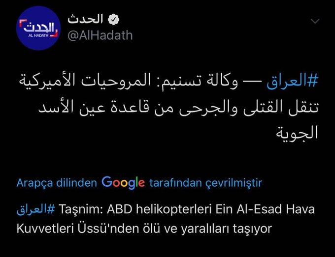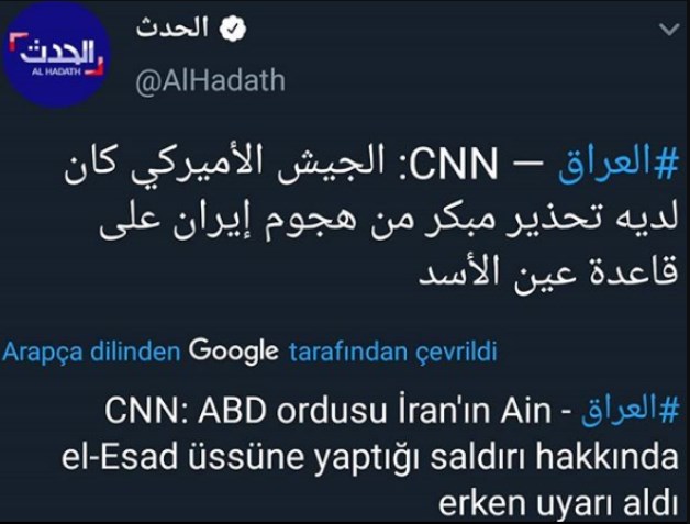 - CNN: “ABD ordusu İran’ın Ayn el-Esad üssüne saldırısına dair erken bir uyarı almıştı.” Türkiye’de bulunan Kürecik Radar Üssü’nden tespit edilmesi üzerine üsler boşaltılmış olabilir.
