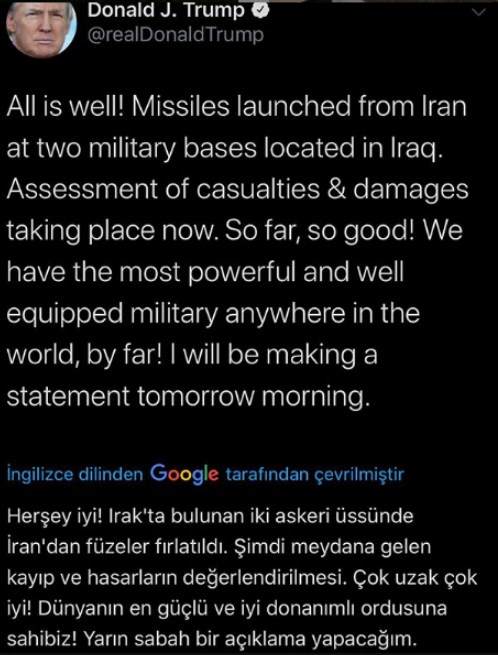 - Hamaney ise: “Irak’taki ABD üslerine başarılı bir füze saldırısı düzenledik. İran bir barış ülkesidir. ABD bölgeden tamamen çıkmalı.” diye açıklama yaptı.
