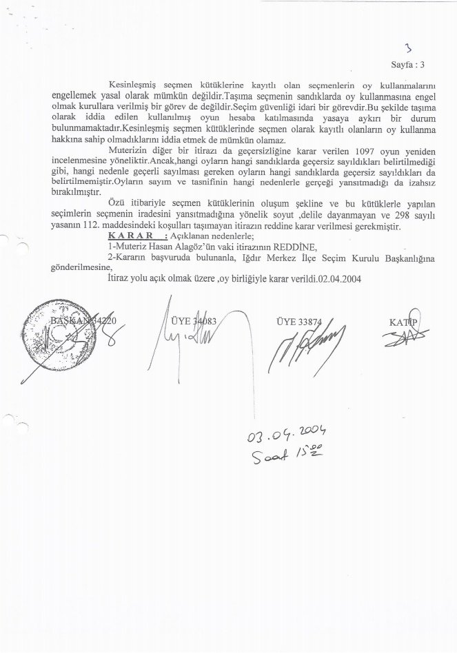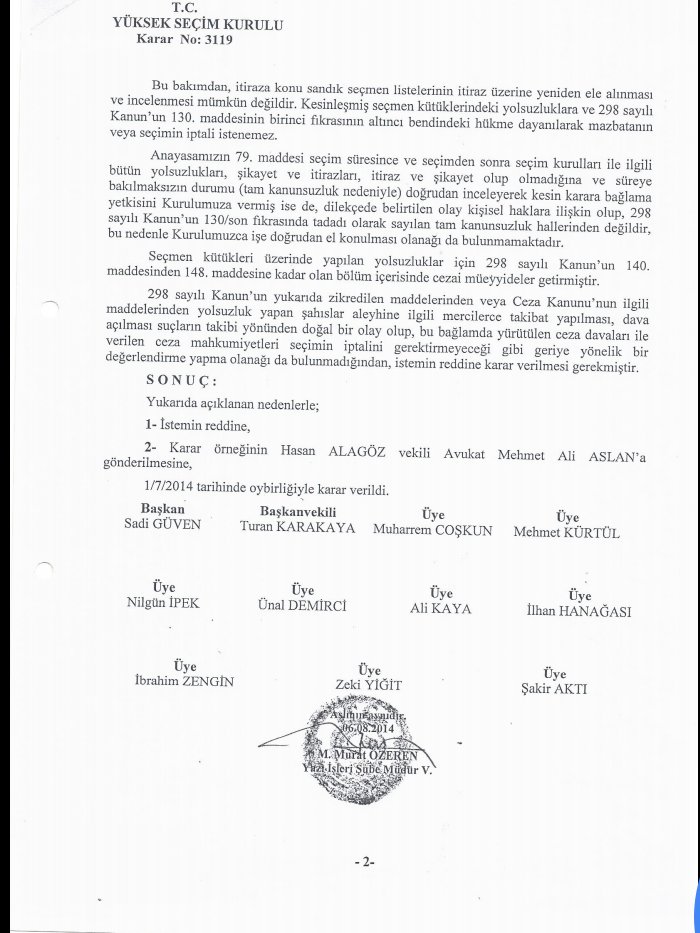 - Seçimlerin iptali talebi ile YSK’ya yapılan itiraz sonucunda YSK şu kararı veriyor. ’’KESİNLEŞMİŞ SEÇMEN KÜTÜKLERİNDE YOLSUZLUĞA DAYANILARAK MAZBATANIN VEYA SEÇİMİN İPTALİ İSTENEMEZ..’’