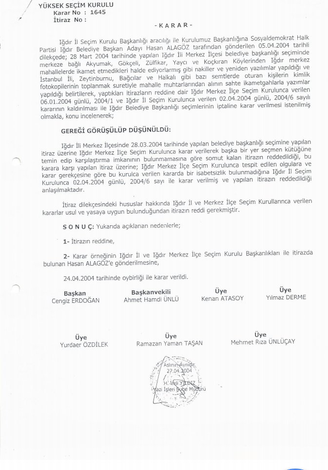 - -Büyükçekmece İlçesinde İstanbul seçimlerindeki alınan oy farkını kapatacak boyutta bir sahte seçmen kaydı yapılmamış olması rağmen Iğdır seçimleri ile ilgili YSK’nın ‘’Hasan Alagöz Kararı’’ emsal bir karardır.