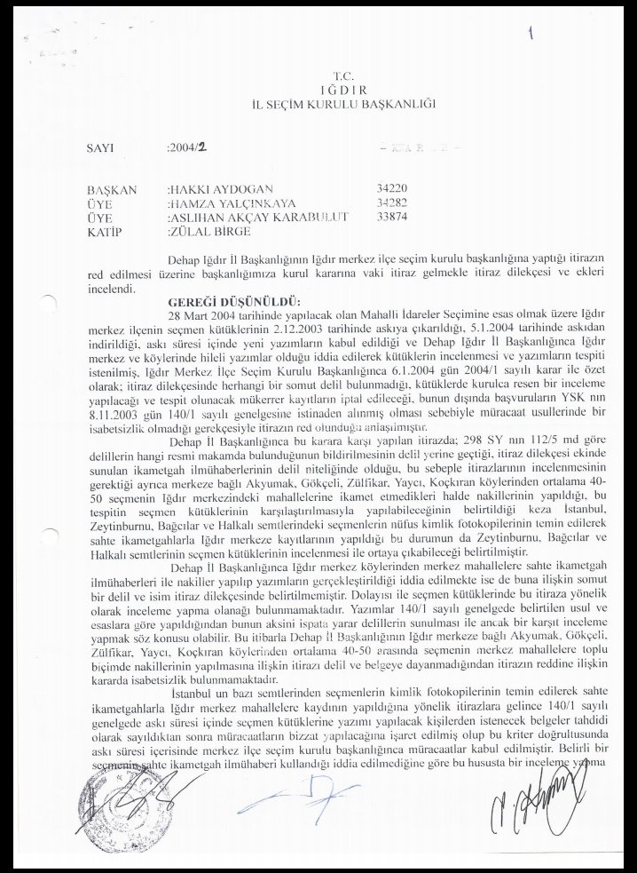 - Iğdır Cumhuriyet Başsavcılığı, yaptığı araştırma sonucunda Iğdır’da oturmadığı halde 3.640 kişinin Iğdır seçimlerinde oy kullandığını tespit ediyor ve dava açıyor. -Iğdır Ağır Ceza Mahkemesinin 2005/220 E ve 2008/147 E sayılı kararı ile sanık muhtarlar ve diğer sanıklara sahte seçmen oldukları gerekçesi ile ceza yağdırıyor.